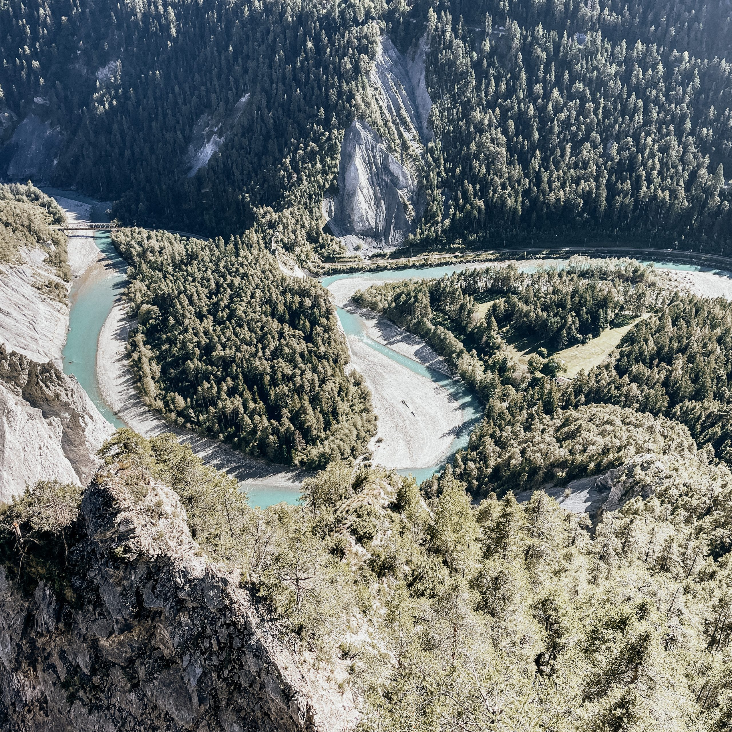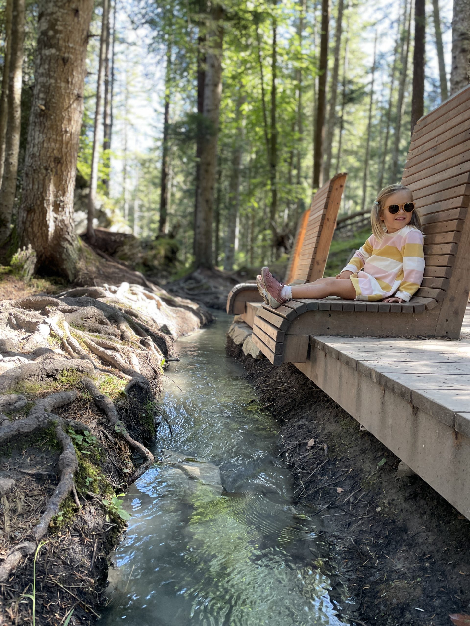 Direkt am Caumasee startet der 3,5km lange Wanderweg zur imposanten Rheinschlucht entlang des Connbächli. Ein kleiner hübscher blauer Bach saust durch den Wald – die Kinder hinterher.