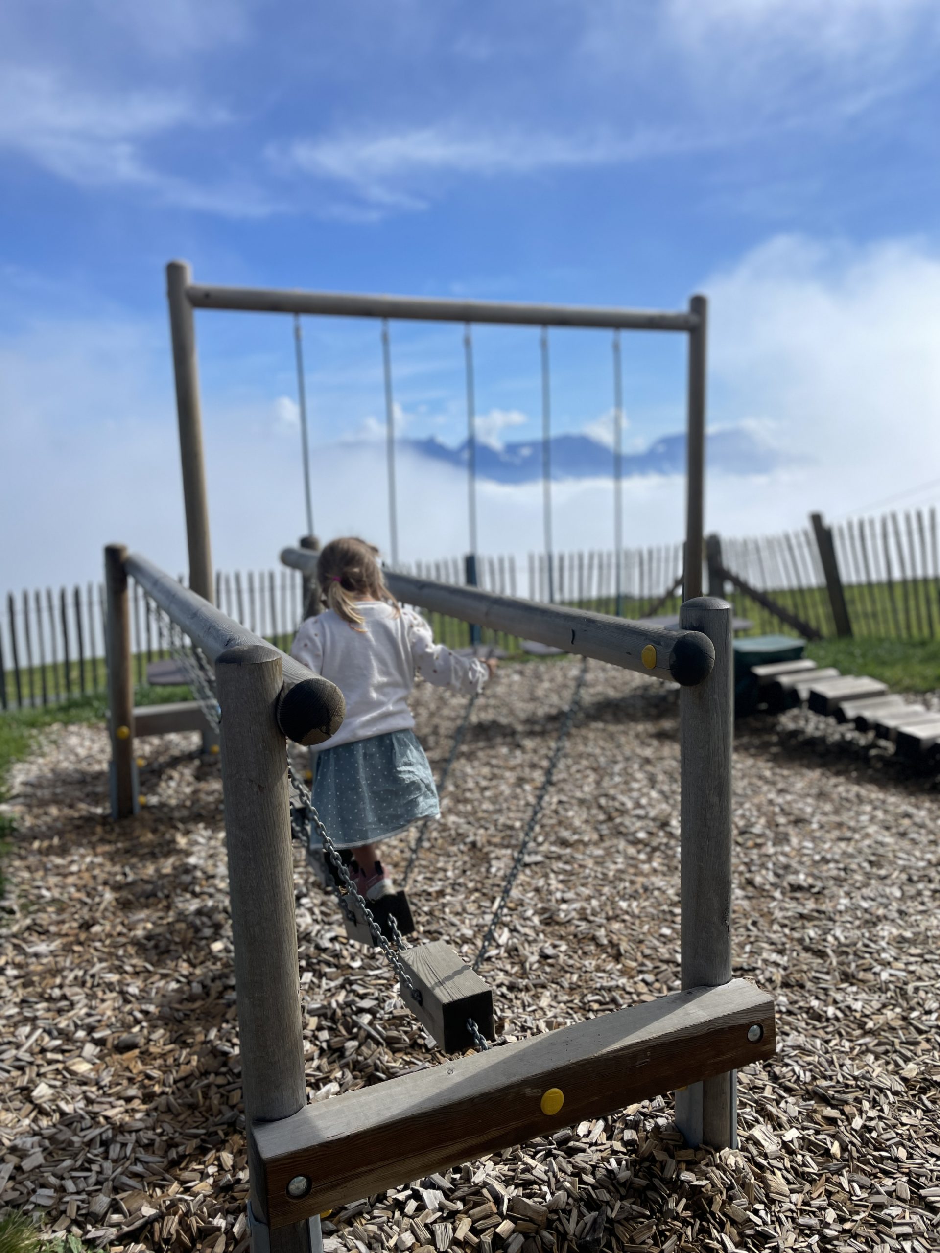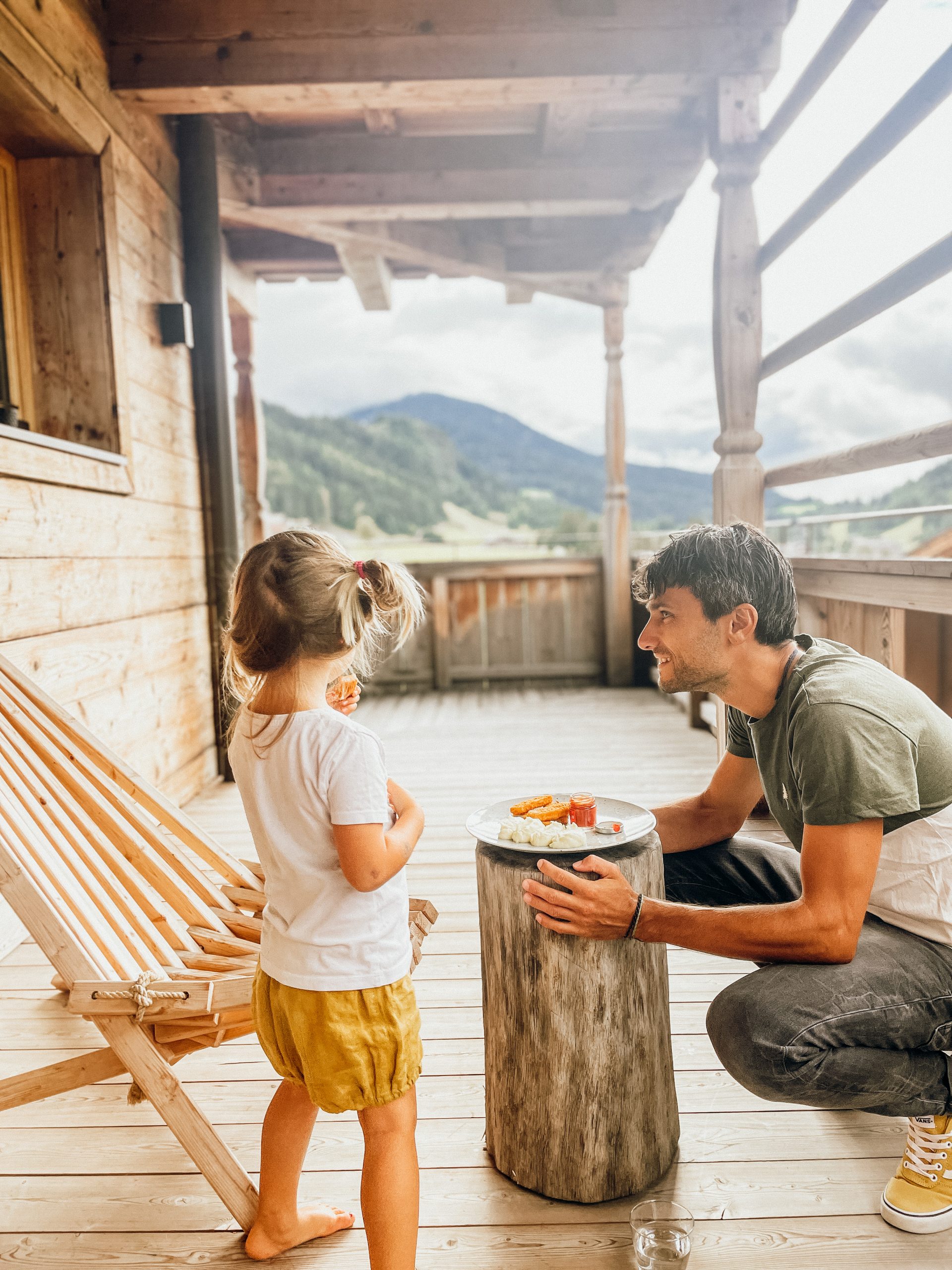 Vorher genießen wir noch die Nachmittagsjause auf der Terrasse. Cappuccino und Kuchen mit Kuhblick. Ein Traum. Dass die Kühlbox mit Eis für die Kinder einfach frei zugänglich für die Kids neben dem Buffet steht, findet Louise glücklicherweise erst am Abreisetag heraus, als sie mit den anderen Kindern den wunderschönen Spielplatz mit Bergblick unsicher macht.