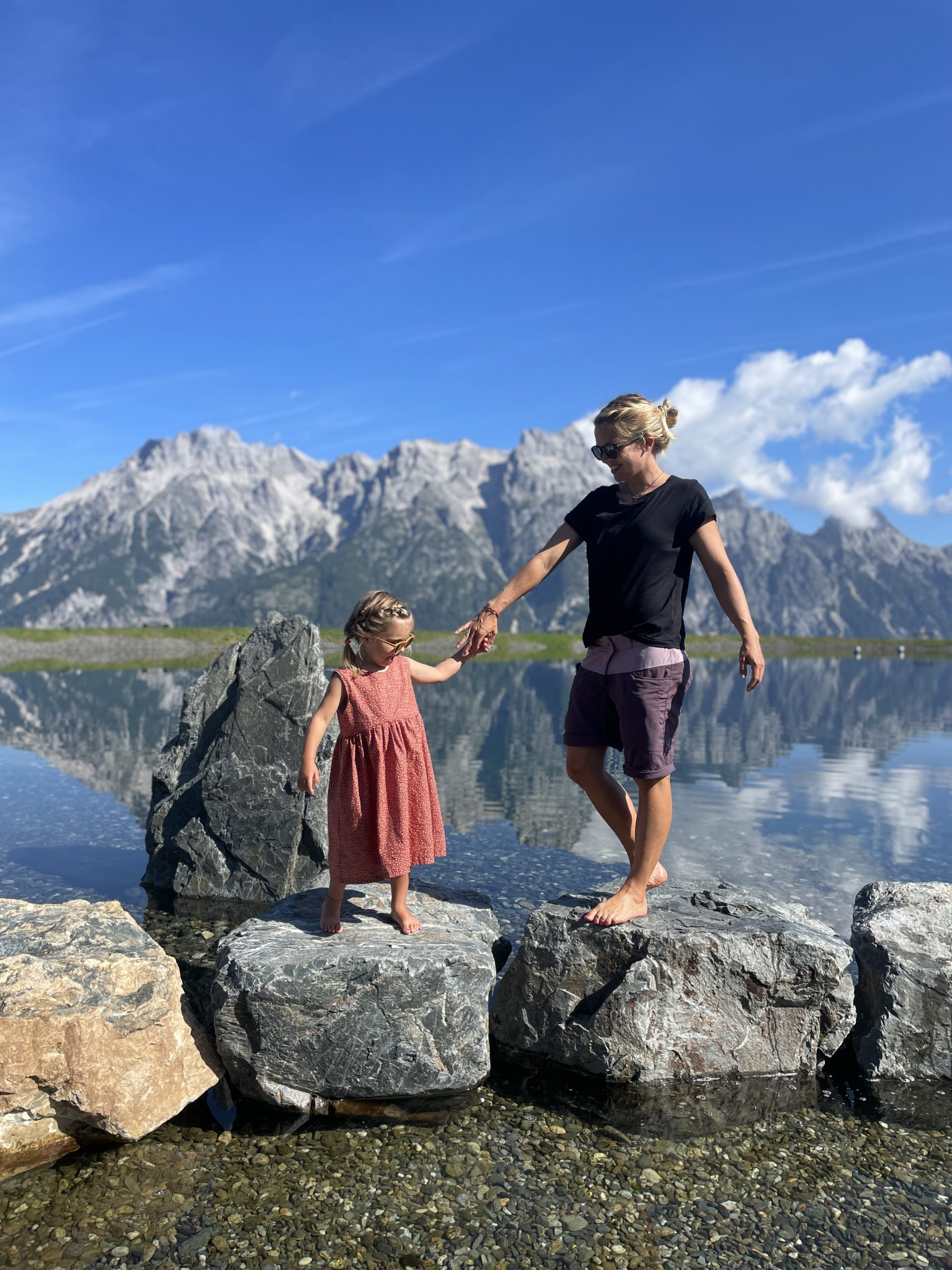 An der Mittelstation der Asitzbahn erwartet die Kinder noch ein ganz besonders schönes Highlight: der Berg der Sinne. Über ein riesengroßes Areal erstreckt sich hier das Kinderparadies deluxe. Über 30 Stationen gibt es hier zu entdecken, darunter ein Wasserspielplatz, Kräuterweg, Klettergerüste, und genügend Platz zum Lernen mit allen Sinnen. Etwas oberhalb befindet sich noch ein irrsinnig schöner Speichersee mit einem Badebereich für Kinder. Wir haben jeden einzelnen Tag hier oben verbracht – einer auf dem Bike – einer mit Louise.
