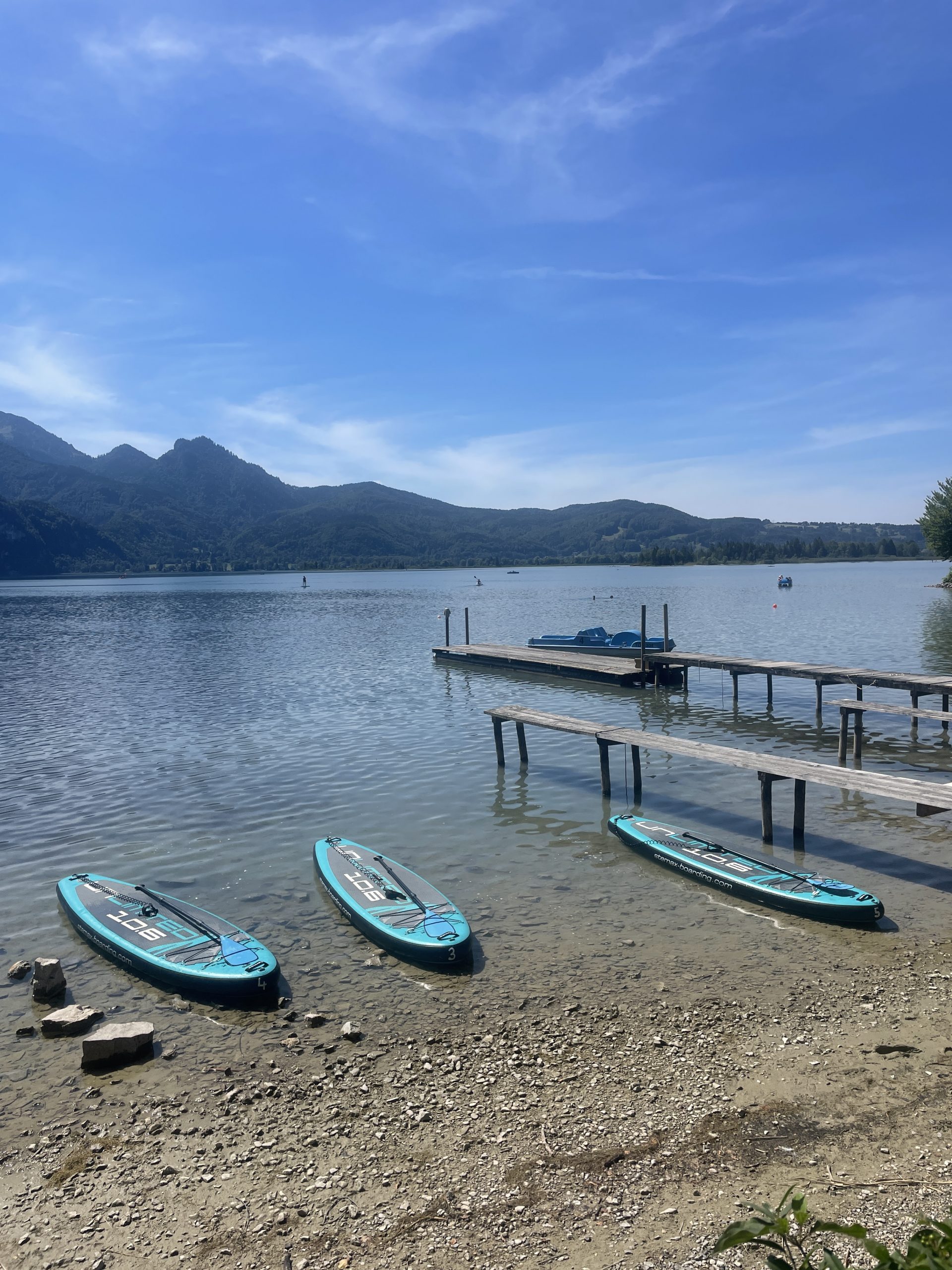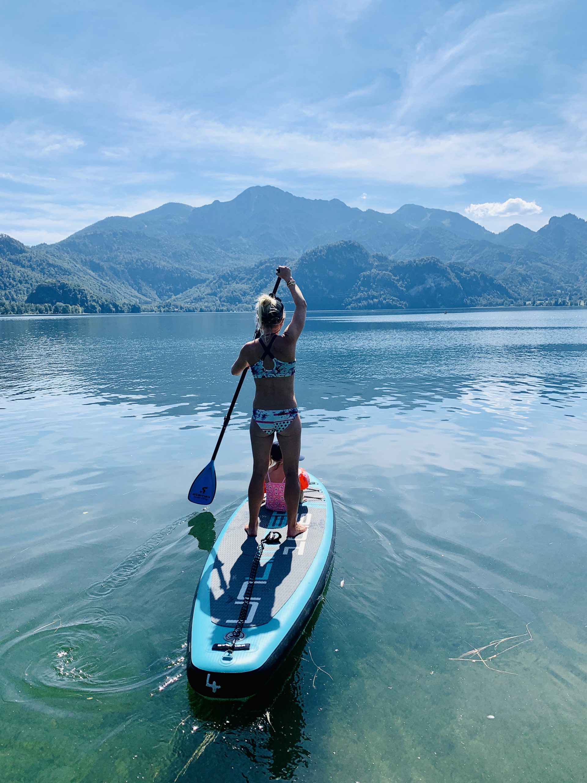Den Kochelsee kannte ich vor meiner Zeit mit Louise nur als Sportkletter-Mekka. Hier gibt es über 100 super Sportkletterrouten, die mit Kind aber allesamt zu schwer sind. Deswegen haben wir uns einen gemütlichen See-Tag mit SUPen und Schwimmen gemacht. SUP-Verleihstationen am See, eine Stunde kostet 12€. Von der Kristalltherme aus fährt auch ein Motorschiff über den See. Man kann entweder eine Rundtour machen, oder gegenüber in Schlehdorf aussteigen und über den Felsenweg zurückwandern. Für größere Kinder ist auch das Erlebnis-Kraftwerk Walchensee ein lohnenswerter Ausflug – ebenfalls per Boot erreichbar!