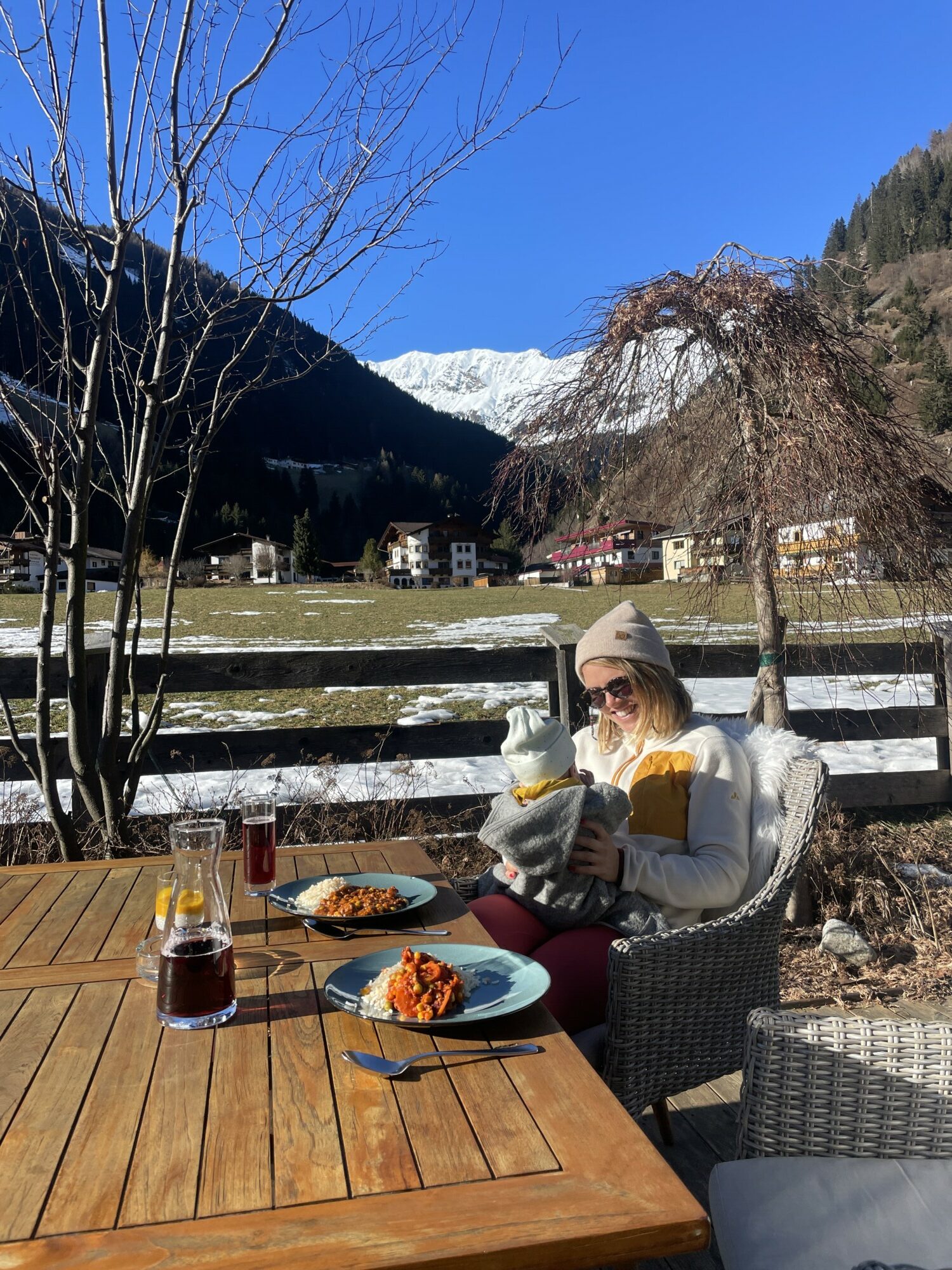 Auch mit Baby Leni kann ich hier wunderbar wagerln und wandern gehen, während Louise im Skigebiet mit Papa ihre Bogerl zieht.